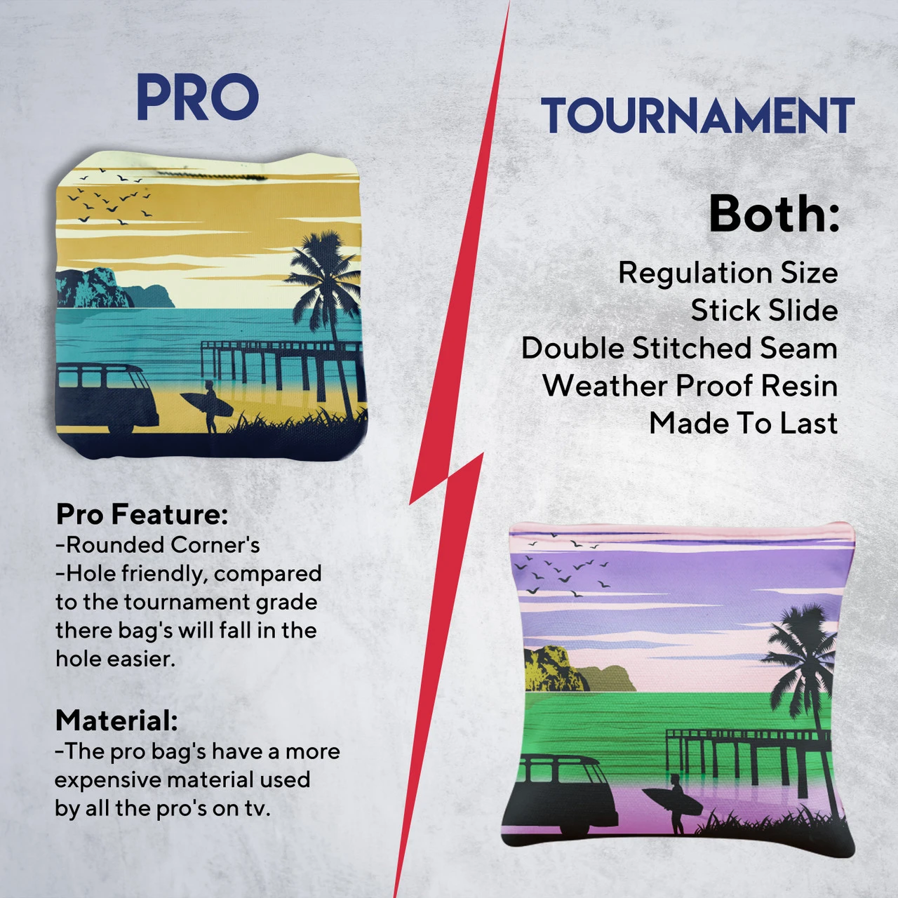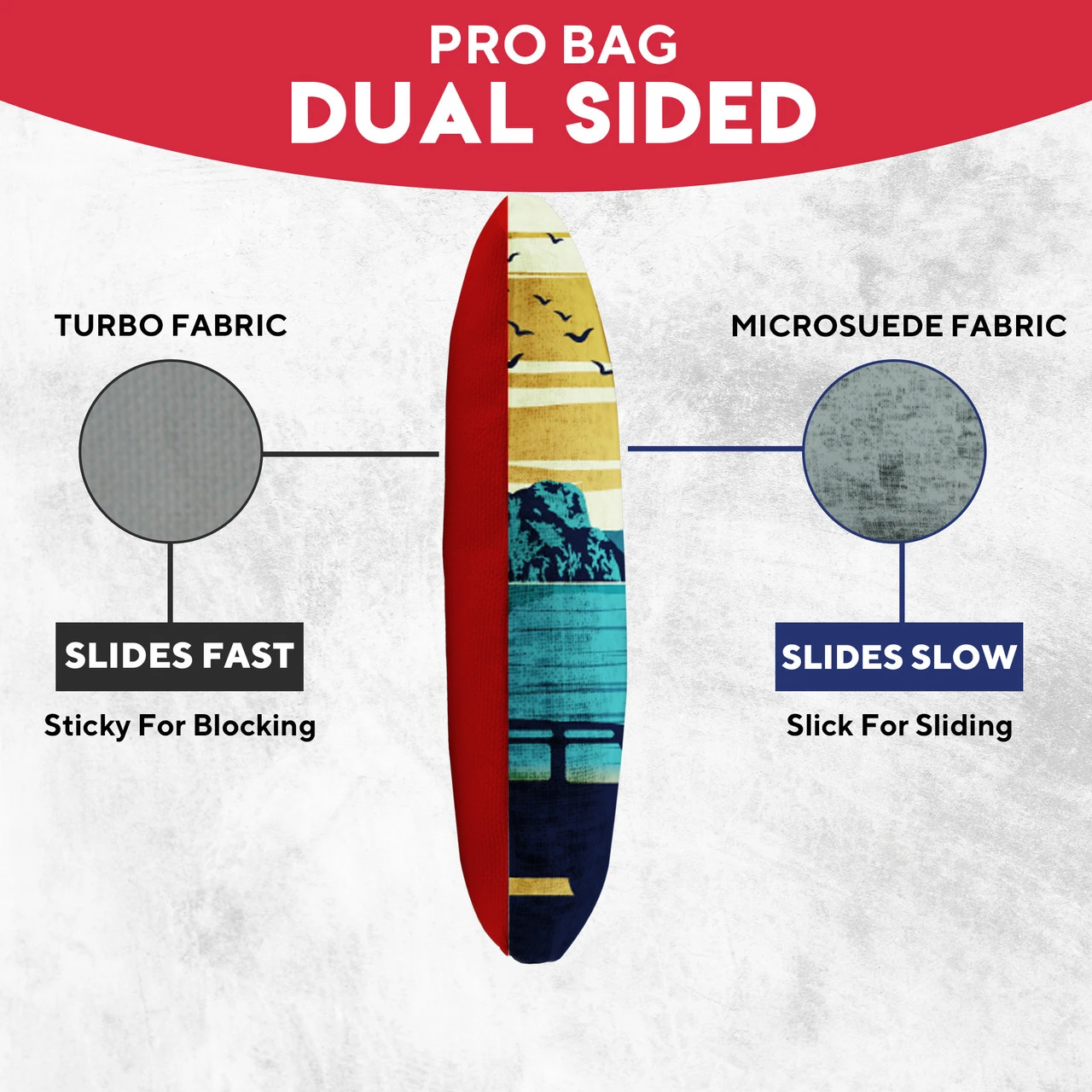 Professional Regulation Cornhole Bags’ dual-sided material construction advances playing strategy and control, allowing you to grab or glide on the board. With various graphic options available, sets can be mixed and matched to fit any style.
