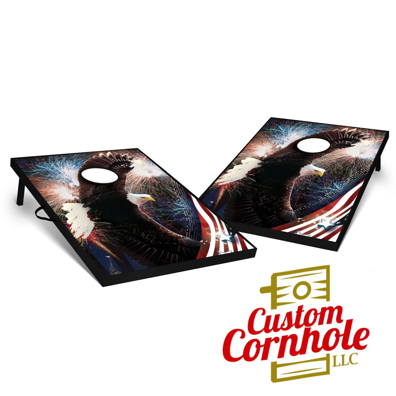Our Tailgate Cornhole Set includes two 2ft by 3ft scoring platforms and two sets of four throwing bags. The scoring platform is all wood, the landing surface is 1/4in MDF which sits on a frame constructed of 1″ by 2″ pine wood. After the scoring platform is painted with black exterior latex paint, we apply the artwork with adhesive vinyl, and then protect the artwork with a coat of polyurethane. The throwing bags are 6″ by 6″ duck cloth and filled with 10oz of whole corn. Synthetic filler is also available for an additional charge. Choose between seventeen different bag colors options.