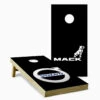 Our Tailgate Cornhole Set includes two 2ft by 3ft scoring platforms and two sets of four throwing bags. The scoring platform is all wood, the landing surface is 1/4in MDF which sits on a frame constructed of 1″ by 2″ pine wood. After the scoring platform is painted with black exterior latex paint, we apply the artwork with adhesive vinyl, and then protect the artwork with a coat of polyurethane. The throwing bags are 6″ by 6″ duck cloth and filled with 10oz of whole corn. Synthetic filler is also available for an additional charge. Choose between seventeen different bag colors options.